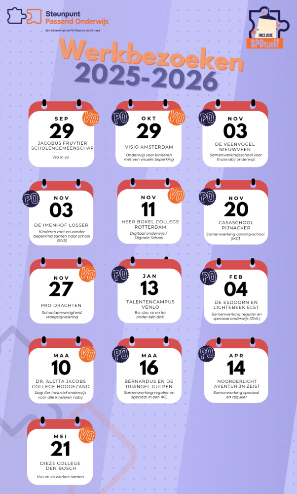 Heb je vragen over passend onderwijs of zoek je inspiratie over inclusief onderwijs? Op de website van het steunpunt passend onderwijs (https://www.steunpuntpassendonderwijs-povo.nl/) vind je veel belangrijke informatie hierover.